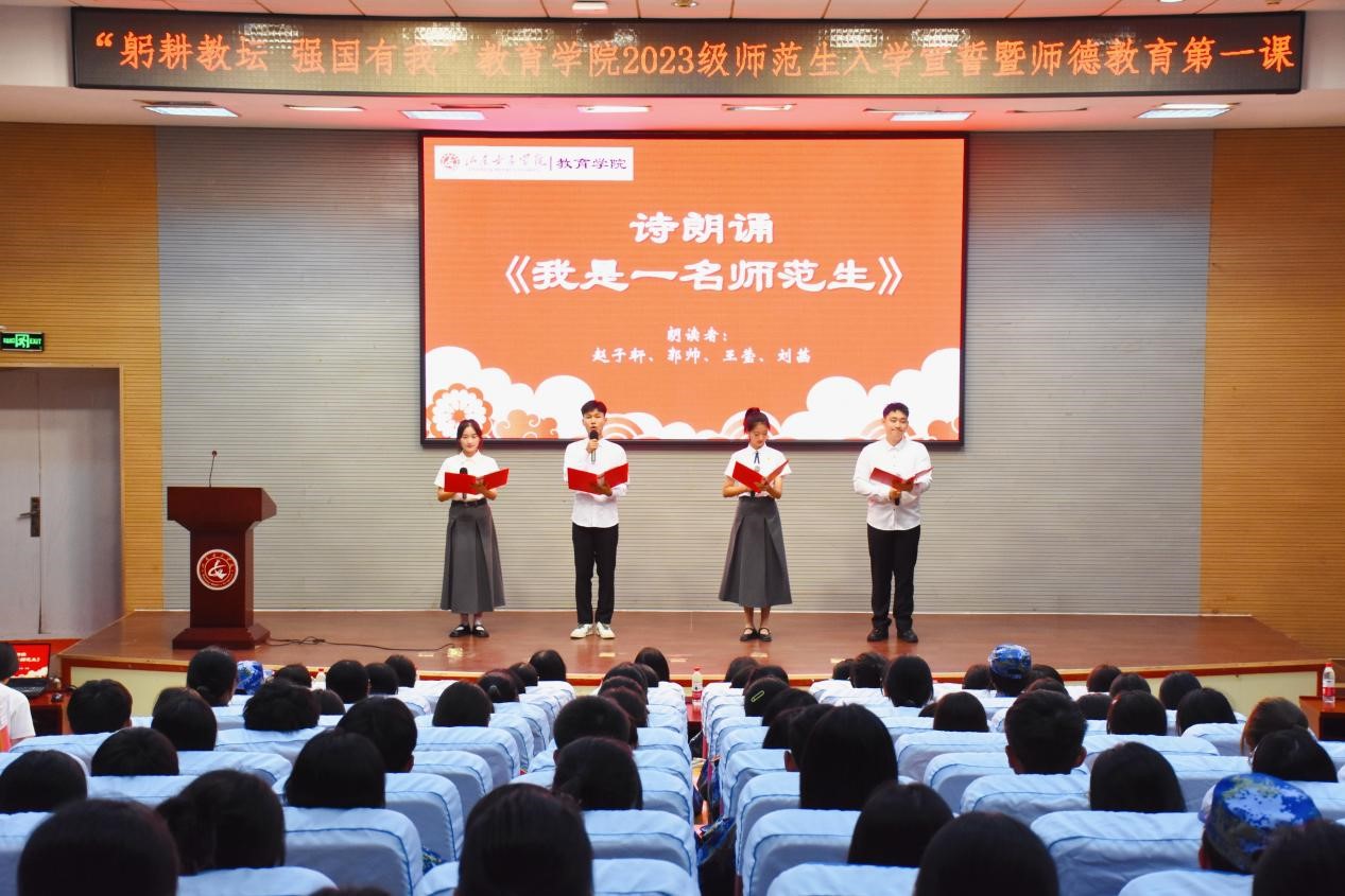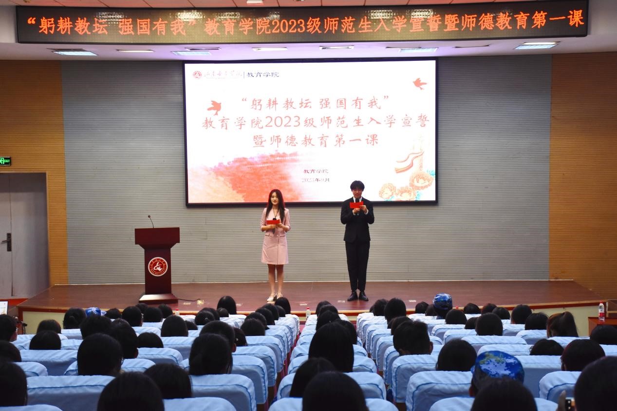 为引导2023级师范新生扣好师德师风“第一粒扣子”,勉励师范生热爱教育事业,增强师范生的使命感和荣誉感。在教师节来临之际,教育学院在图书馆一楼报告厅举行“躬耕教坛,强国有我”2023级师范生入学宣誓暨师德教育第一课。教育学院党委书记崔江宁、副书记路敏、山东高校十大师德标兵徐伟教授、教育学院辅导员及班主任老师、2023级师范专业新生代表参加活动。