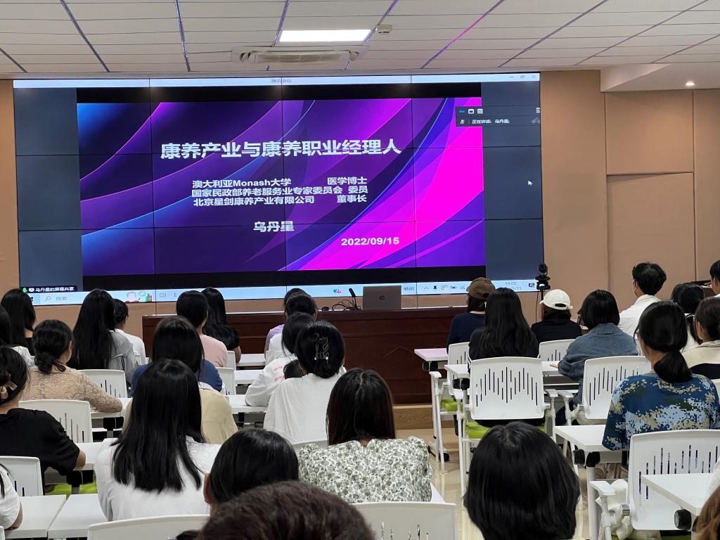 乌丹星围绕康养产业特点、康养产业对人才的8大能力需求、康养职业经理人养成等方面进行了详细阐述,内容丰富,观点新颖,既有深入浅出的理论阐述,又有旁征博引的案例分析,更有实践层面的管理思路,使养老服务管理新生对养老产业和未来从事的职业有了清晰的认知,坚定了理想信念,激发了学生投入康养产业和养老事业的热情。