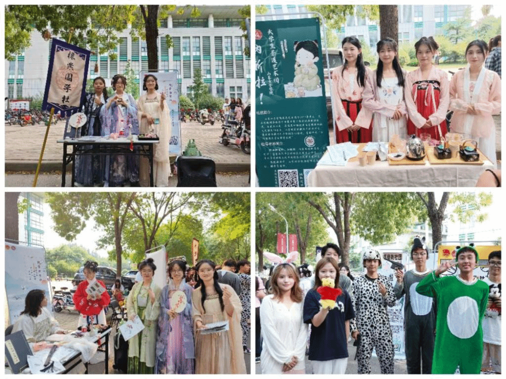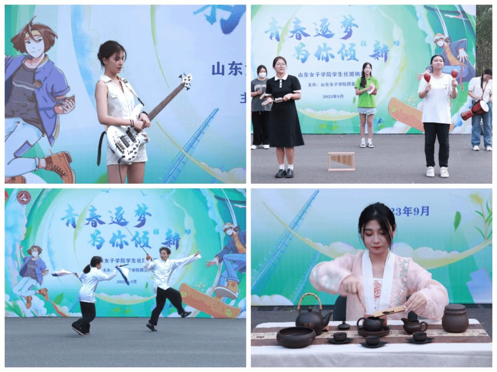 活动现场气氛热闹,人头攒动。各社团结合自身特色,通过展板宣传、互动体验、才艺表演、成果展出、趣味闯关等多种形式,展现了精彩纷呈、各具魅力的社团风采。明镜台汉服社、棣棠国学社、大学生茶道艺术团、灵熙旗袍社团、传统文化学会的社团成员们身着中式服装出场,襦裙霓裳,曲裾轻舞,让人对中华优秀传统文化的传承心向往之;青年志愿者协会展位前,通过开展校内外志愿服务获得的累累硕果,吸引了一大批学生的关注;梅花桩武术协会带来一场精彩的视觉盛宴,散打、刀、枪、剑和棍的表演让学生们目不转睛;吉他社“入海口乐队”登台亮相一展歌喉。各学生社团精心筹备、各展所长,让同学们“沉浸式”“互动式”的近距离感受了一场女院第二课堂文化活动的盛宴,立体化展示出学校青年学生的多彩文化生活和向上青春风采,也为新同学的自我发展和综合素质提升提供了平台。