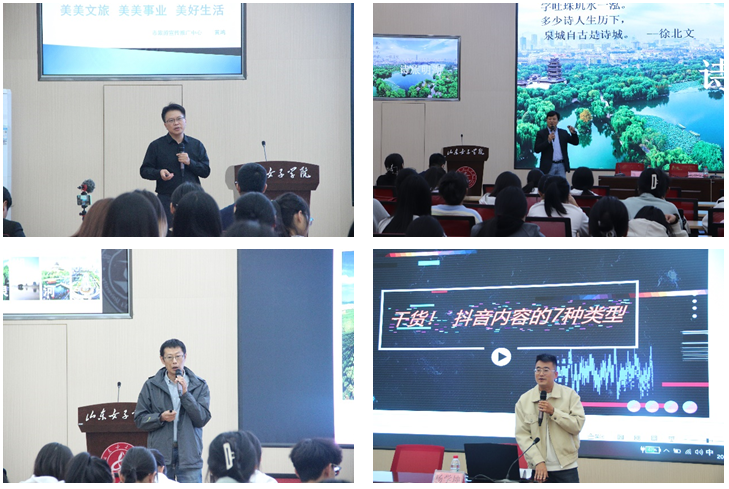 黄鸿以《美美文旅 美美事业 美好生活》为题,带领同学们了解诗和远方是最幸福的事业。朱晓宽分享了《诗旅明湖》,济南自古有诗城的雅号,将明湖的每个景点用一诗一人一故事展开,开启了一段诗词之旅。刘虎讲解了《跟着老舍赏济南》,通过老舍先生的视角,带领同学们认识济南。杨学坤从如何选择有吸引力的主题进行讲授,通过分析成功的短视频案例,帮助同学们提高了短视频制作能力。