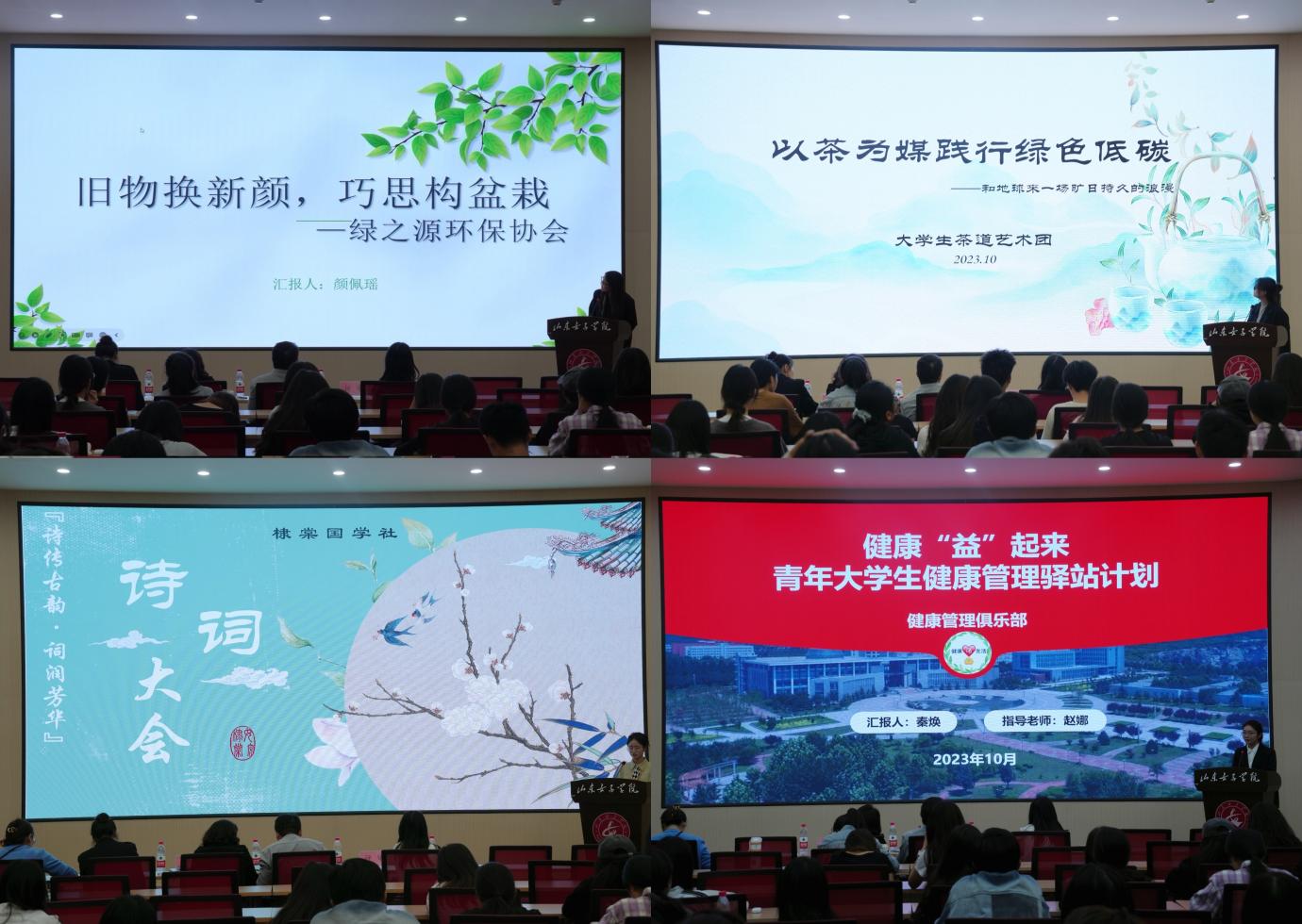 本届文化节共有28个学生社团,提交了26项活动进行立项答辩。各学生社团负责人依次上台答辩,围绕“理想信念”“科创女院”“绿色女院”“健康女院”四大主题进行项目展示。春雨合唱团“礼赞新时代 奋进新征程”经典歌曲翻唱比赛,追随榜样脚步,汲取奋进力量;绿之源环保协会“旧物换新颜 巧思构盆栽”传递绿色低碳发展理念;健康管理俱乐部“健康‘益’起来 青年大学生健康管理驿站计划”呼吁同学走下网络、走出宿舍、走向操场,积极进行体育锻炼;青年志愿者协会青年绿色科技创新大赛,提升学生科技创新意识和能力。评委们根据各项活动的可行性、实效性和发展空间等方面进行评议,现场反馈项目修改意见。