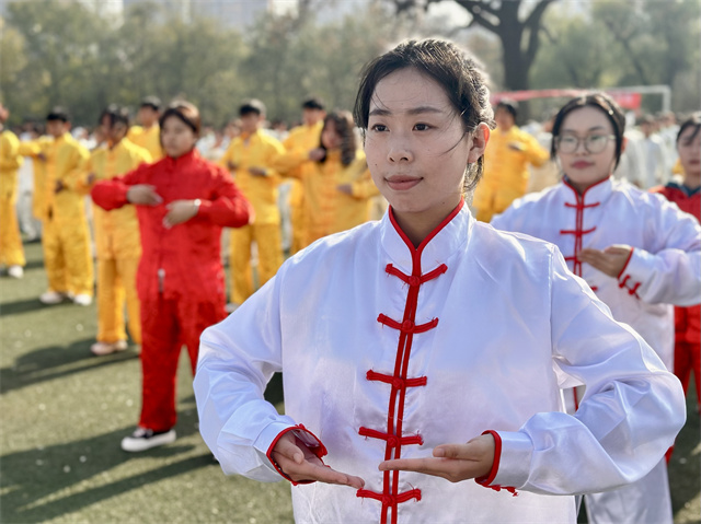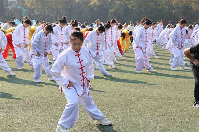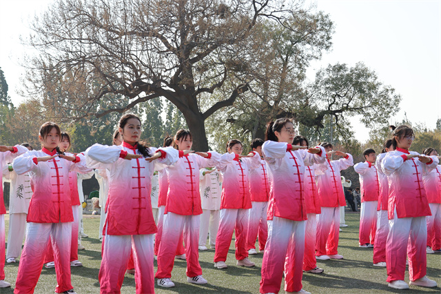 个人赛中,同学们身着练功服,在女院古唐槐树的映衬下,形成一道靓丽的风景线。