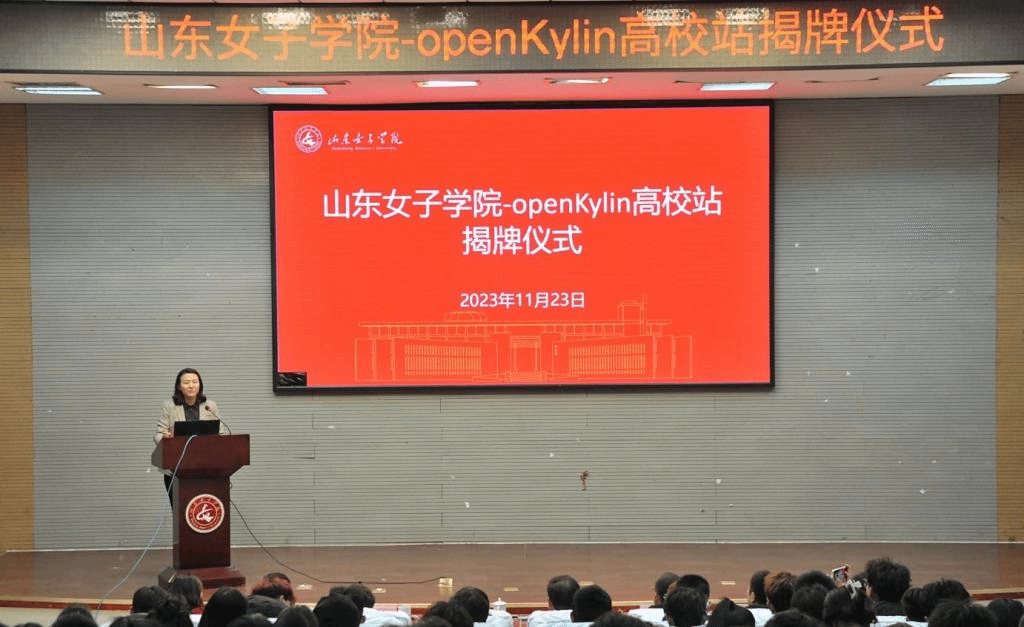 11月23日,山东女子学院-openKylin高校站揭牌仪式在图书馆一楼报告厅顺利举行。副校长李缨,数据科学与计算机学院院长孙洪峰、副院长田杰、季振东、院长助理刘丽,麒麟软件山东事业部总经理李云龙、校企合作总监苏胜男,openKylin社区技术委员会委员王文竹、生态合作负责人马发俊以及数据科学与计算机学院教师和学生代表等出席活动。孙洪峰主持揭牌仪式。