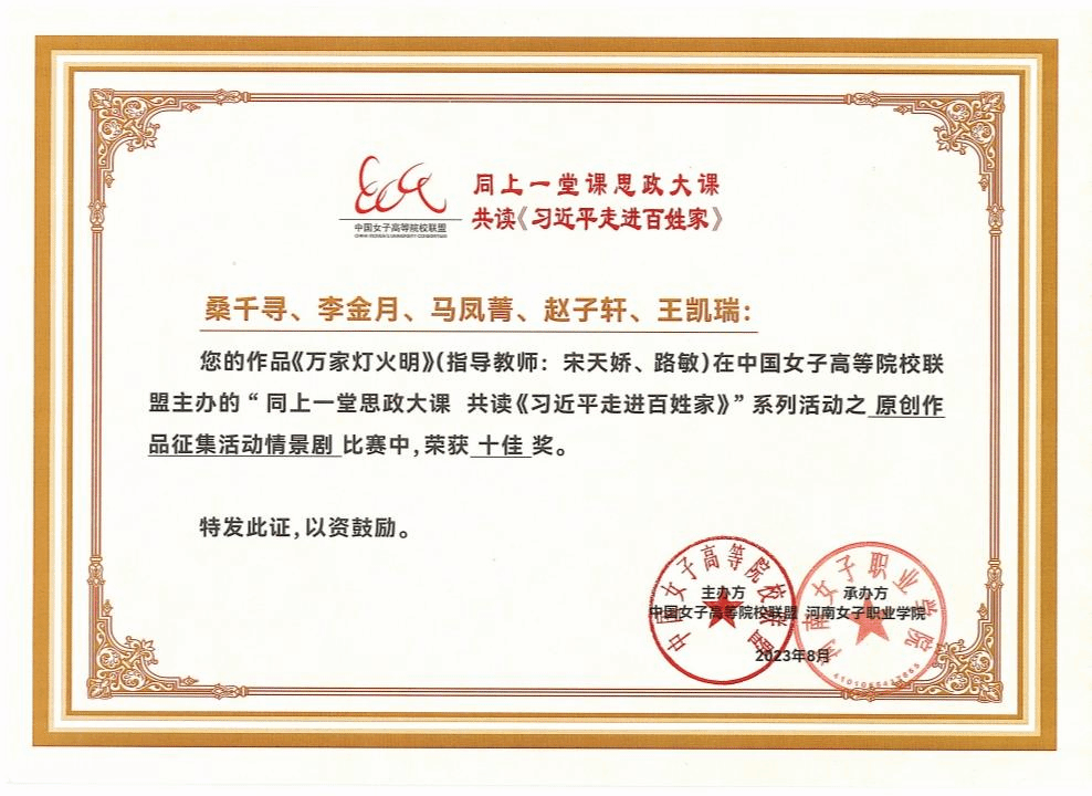 近日,由中国女子高等院校联盟主办的“同上一堂思政大课,共读《习近平走近百姓家》”系列活动之原创作品征集活动情景剧大赛中,由教育学院桑千寻、李金月、马凤菁、赵子轩、王凯瑞五名同学所创作的情景剧作品《万家灯火明》荣获十佳奖。