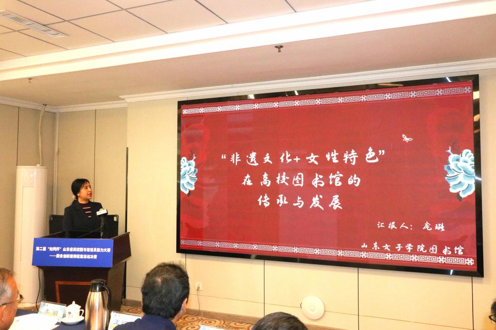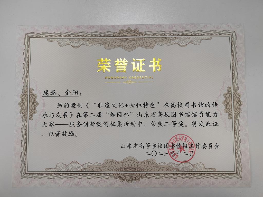 近日,在青岛大学举办的第二届“知网杯”山东省高校图书馆馆员能力大赛中,校图书馆申报的《“非遗文化+女性特色”在高校图书馆的传承和发展》案例成功晋级决赛,并荣获二等奖。另一篇《山东女子学院图书馆“RED学科服务 ”》案例荣获三等奖。