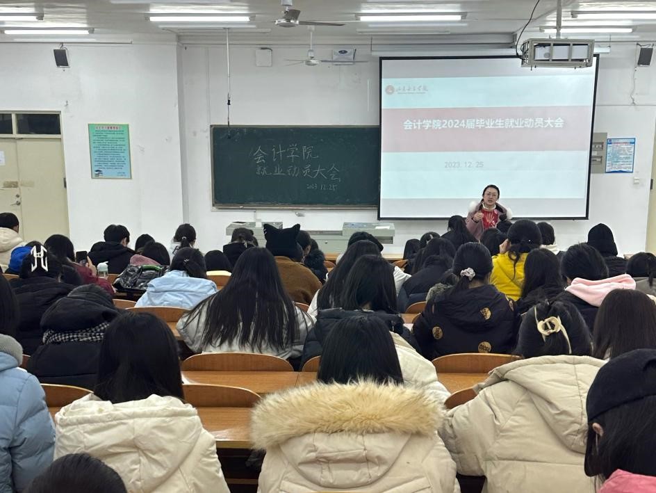 为贯彻落实2024届全国普通高校毕业生就业创业工作会议精神,教育引导毕业生提高就业意识,推动毕业生更高质量更加充分就业。12月25日,会计学院召开2024届毕业生就业动员会暨出国留学项目推介会。会议特别邀请了继续教育学院院长陈珂、国际交流与合作处处长李云鹏,会计学院负责人、专业教师、毕业班辅导员及2024届毕业生参加会议。会计学院党委书记孔晓晓主持会议。