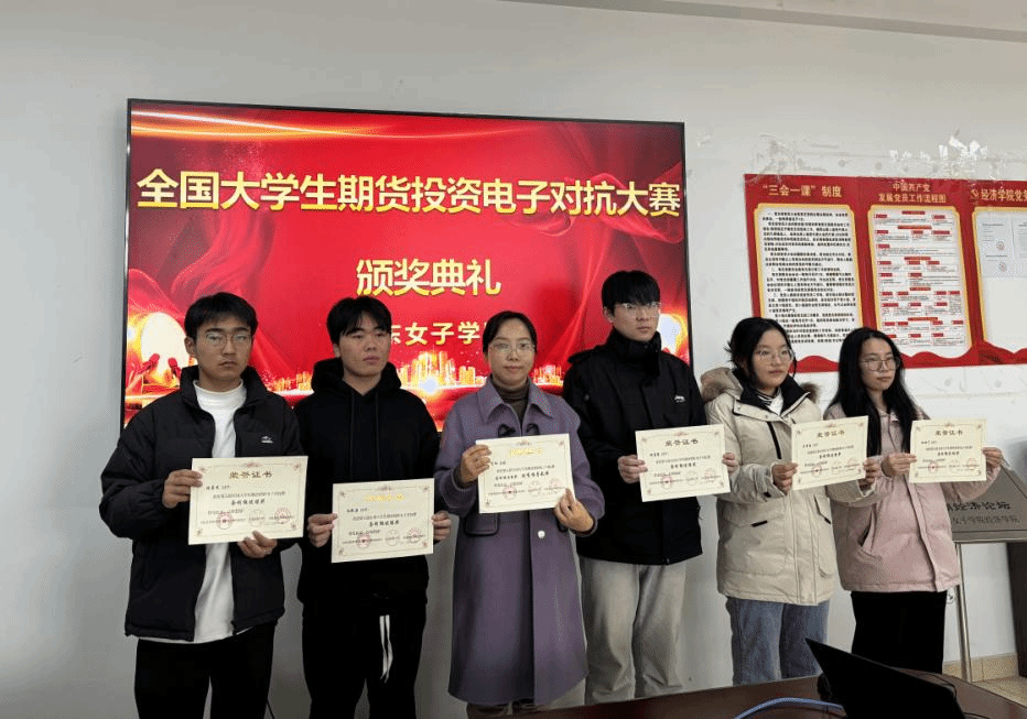 近日,经济学院举行第五届全国大学生期货投资电子对抗赛颁奖典礼。经济学院副书记赵晓琳、副院长崔俊富、指导教师沈旭与永安期货山东分公司经理王昊辰等企业代表参加此活动。