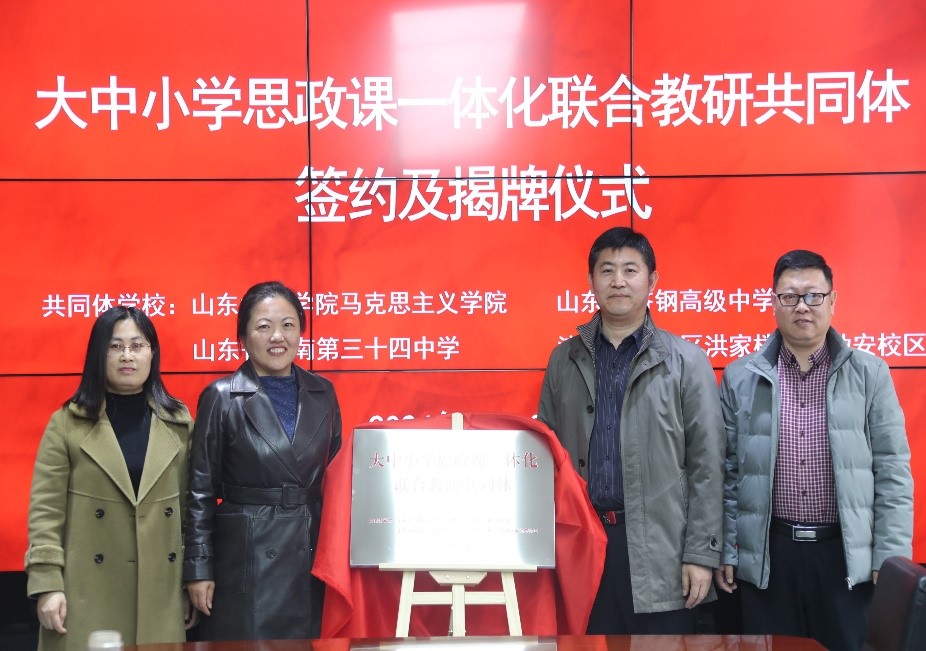 为深入贯彻落实立德树人根本任务,推进大中小学思政课一体化建设,3月18日上午,马克思主义学院在山东省济南第三十四中学参加“大中小学思政课一体化联合教研共同体”签约揭牌仪式。马克思主义学院院长姚树欣、山东省济钢高级中学副校长王文涛、济南市第三十四中学领导班子、历城区洪家楼小学幼安校区副校长季英华及高中部相关教师参加活动。