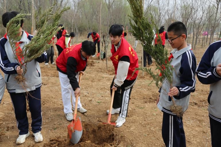 “欲得青山翠,挥锄种绿枝。”在植树环节,全体师生相互协作,挥镐舞锄、放苗扶正、填土压实,共同种下一颗颗爱心树、希望苗,共同为大地添新绿。