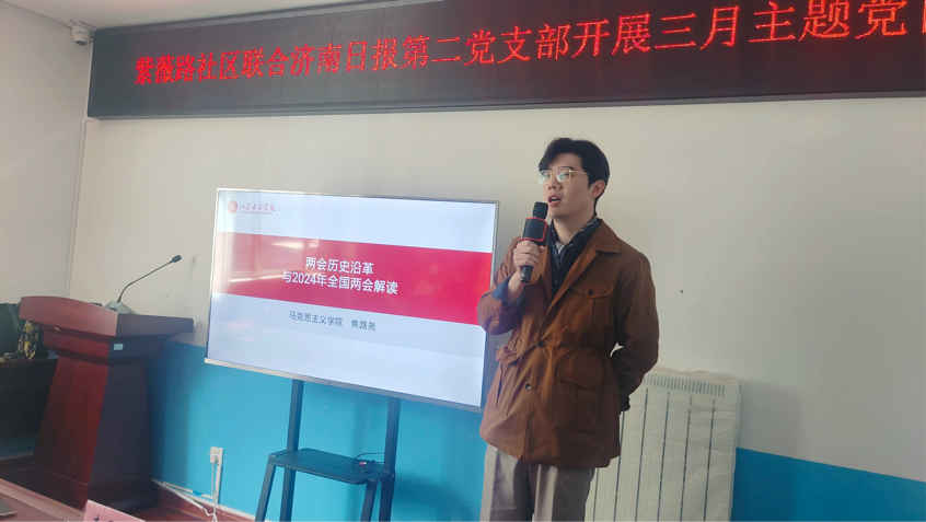 3月29日上午,红心讲师团成员、马克思主义学院教师焦路尧带领“青言青语”大学生理论宣讲团学生代表前往紫薇阁社区开展两会专题宣讲,紫薇阁社区全体党员及济南日报第二党支部党员代表参加了本次活动。