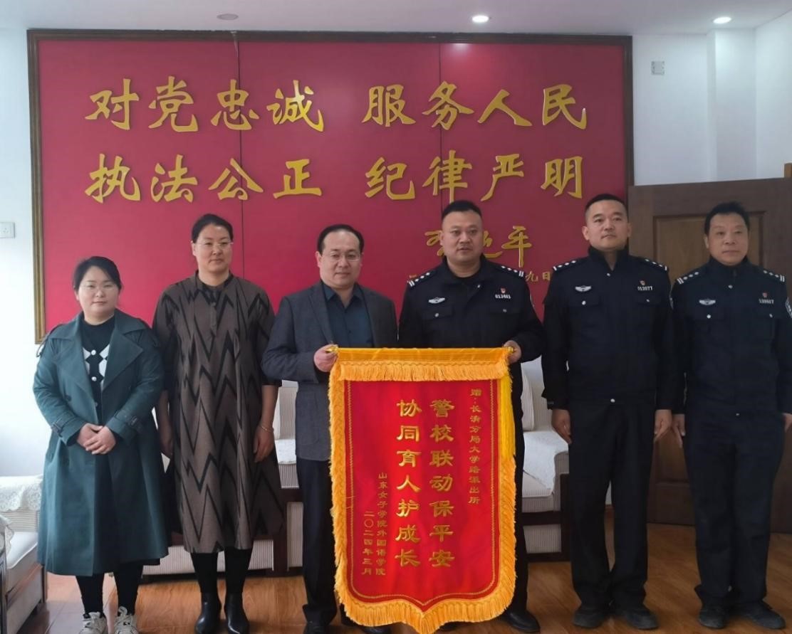 4月9日,在学校保卫处处长武凯的协调带领下,外国语学院副书记、学生党支部书记、辅导员将一面写有“警校联动保平安,协同育人护成长”的锦旗送到了大学路派出所赵书成所长手中,以此致谢派出所民警长期以来维护校园安全、保护师生周全所付出的辛苦努力,并就支部共建共联达成意向。