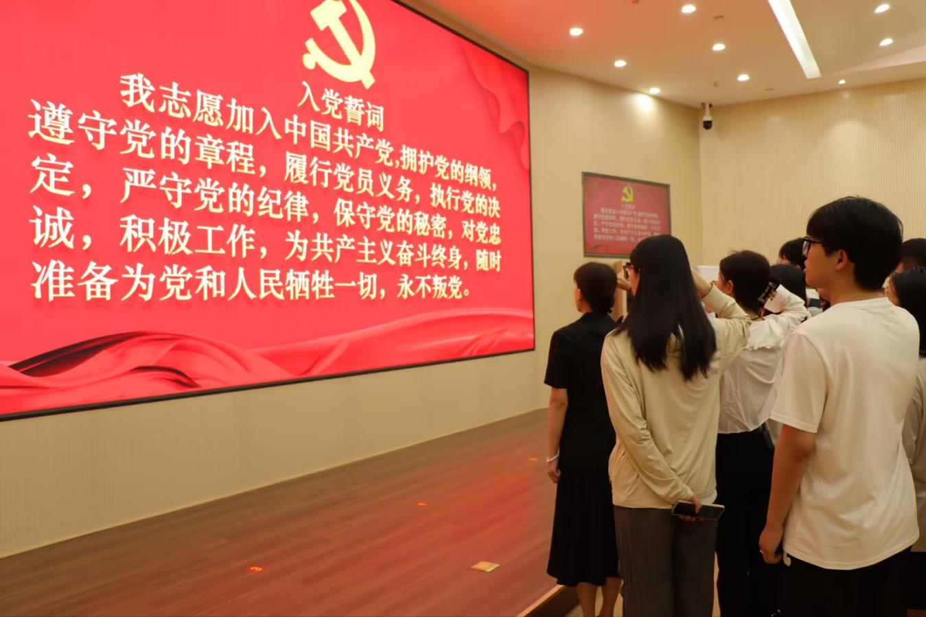 其次,依托主题党日活动开展重温入党誓词活动。在各学院学生党支部书记的带领下,全体同志面对鲜红的党旗,庄严地举起右拳,预备党员进行入党宣誓,党员重温了入党誓词,铿锵有力的誓言回荡在会场每一个角落,进一步坚定了学生党员们的理想信念和使命担当。