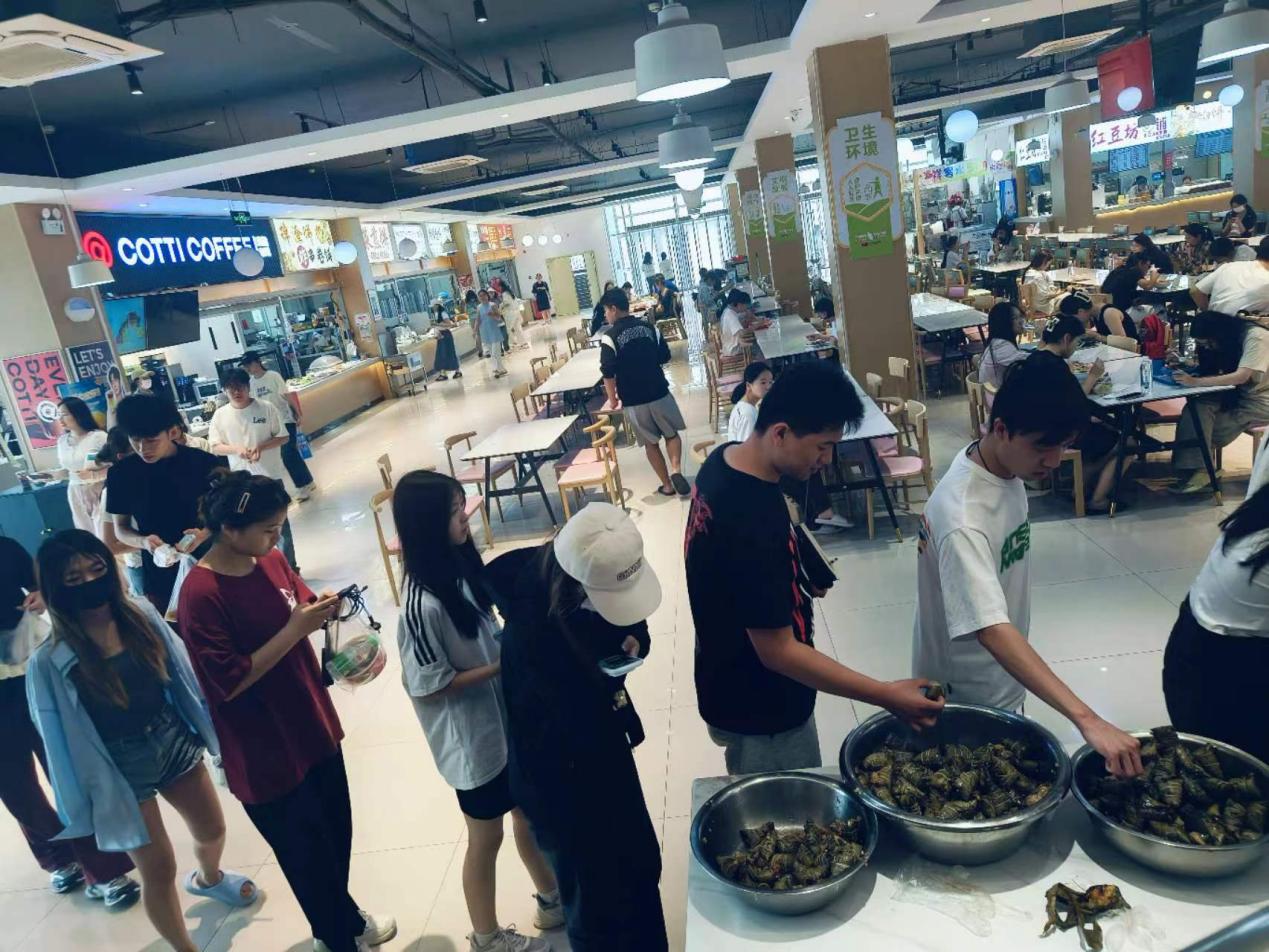 6月8日上午10点,餐厅的工作人员在各个大厅的醒目位置,摆好长桌,上面放满了多种口味的粽子,同学们排起长长的队伍,脸上洋溢着笑容。大家在领取粽子时还不忘说一句“谢谢,端午安康”,喜悦的不只是同学们,也有餐饮从业人员。不论甜咸,团圆是最好的馅,小小的粽子总能勾起大家漫漫思乡情,让没有回家的同学也感受到了家的温暖。不少学生一边品尝,一边讨论各自老家端午节的习俗,同时也纷纷拍照留念,发朋友圈、发抖音等表达对学校的祝福和对家人的牵挂。8日中午餐,一餐三楼教工餐厅也为教职工准备了免费粽子。
