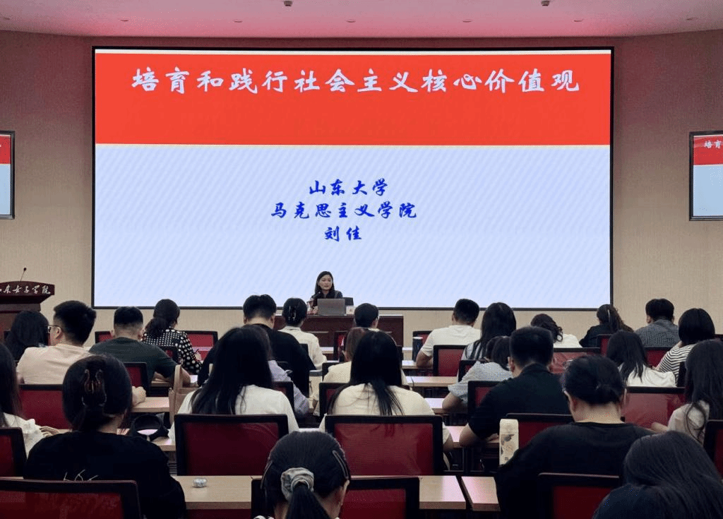为进一步发展壮大主流价值、主流舆论、主流文化,5月24日下午,学校在求真楼报告厅举行“社会主义核心价值观进基层”宣讲报告会,山东省社会主义核心价值观基层宣讲团成员、山东大学马克思主义学院思想道德与法治教研室主任、副教授刘佳来校作宣讲报告。学校各二级学院学工办主任、思政课教师、辅导员和学生代表参加报告会,学校党委宣传部负责同志主持报告会。