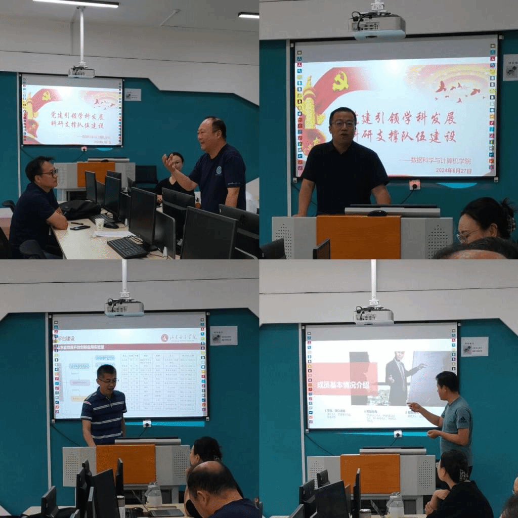 6月27日上午,数据科学与计算机学院在求实楼214召开了主题为“党建引领学科发展,科研支撑队伍建设”的科研团队工作汇报会。本次会议的召开,旨在全面总结本学期学院科研团队的各项工作,展示科研成果,分享科研经验,并为下一阶段的科研工作谋篇布局。学院党委书记潘建勋、院长孙洪峰以及特邀评委经济学院院长沈传河、社会与法学院副院长孙旭友出席了会议。副院长田杰主持会议。