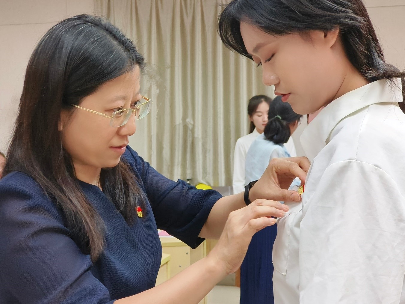 与会教师党员为新发展党员佩戴党徽,象征着党的事业的传承与发展。“佩戴上沉甸甸的党徽,深刻认识到了自己身上肩负的使命和责任”。新党员代表孔庆雨说,“我们要向革命前辈学习,向身边优秀党员看齐,无私奉献、积极作为,为中国特色社会主义事业贡献青春力量”。