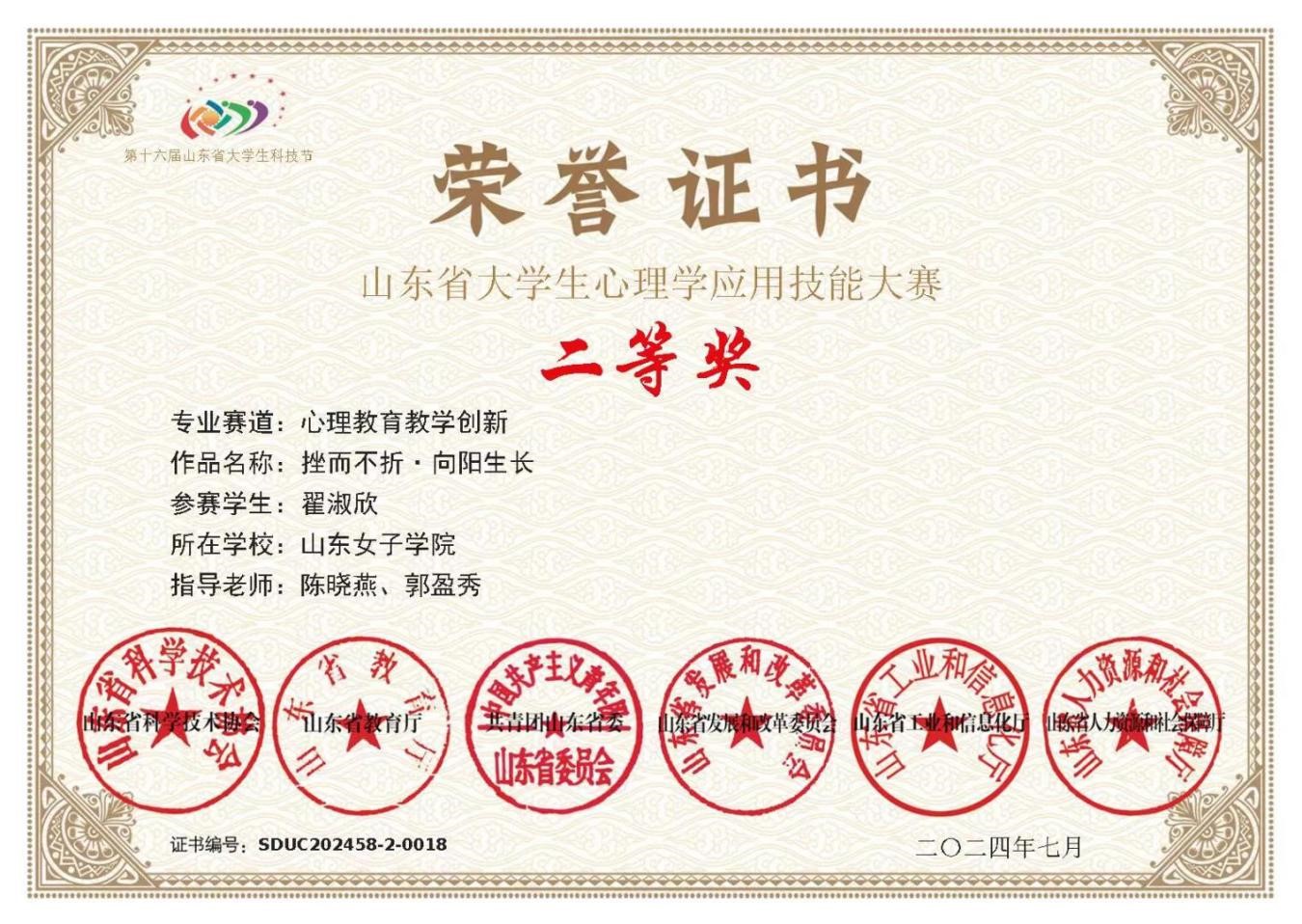 近期,由山东省科学技术协会、山东省教育厅、共青团山东省委等六部门联合主办,山东省心理学会、济宁职业技术学院承办的“第十六届山东省大学生科技节—山东省大学生心理学应用技能大赛”在济宁职业技术学院落下帷幕。教育学院应用心理学 21本学生翟淑欣在陈晓燕老师和郭盈秀老师指导下获心理教育教学创新赛道二等奖。