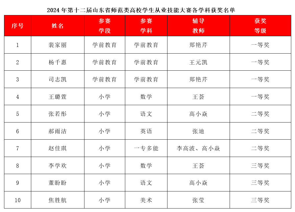 7月19日-21日,第十二届山东省师范类高校学生从业技能大赛决赛在鲁东大学举行,本次省级决赛分为4个学段,22个学科,分为钢笔字考察、固定题目模拟上课、随机题目模拟上课、现场答辩四个环节。学校学前教育、小学教育两个师范类专业的学生在大赛中斩获佳绩,获奖率100%,实现历史性的突破。学前教育获一等奖3项,小学数学获一等奖1项,小学数学、小学语文、小学英语、一专多能获二等奖3项、三等奖2项。