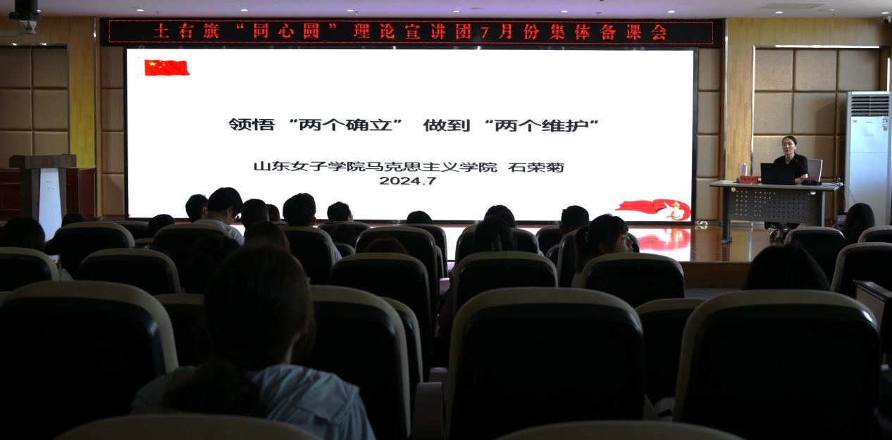 备课会上,中华女子学院马克思主义学院副院长苗伟东,山东女子学院马克思主义学院副院长石荣菊,内蒙古工业大学马克思主义学院2022级硕士研究生马沛然为全旗的理论宣讲员进行宣讲培训。其中,石荣菊以《领悟“两个确立”做到“两个维护”》为题,结合宣讲经验,从历史逻辑、理论逻辑和现实逻辑对“两个确立”进行了深入阐述,并就如何做到“两个维护”与土右旗“同心圆”宣讲团的成员们进行了深入地交流。与会学员纷纷表示,此次培训不仅丰富了宣讲内容,同时也拓宽了宣讲视野。