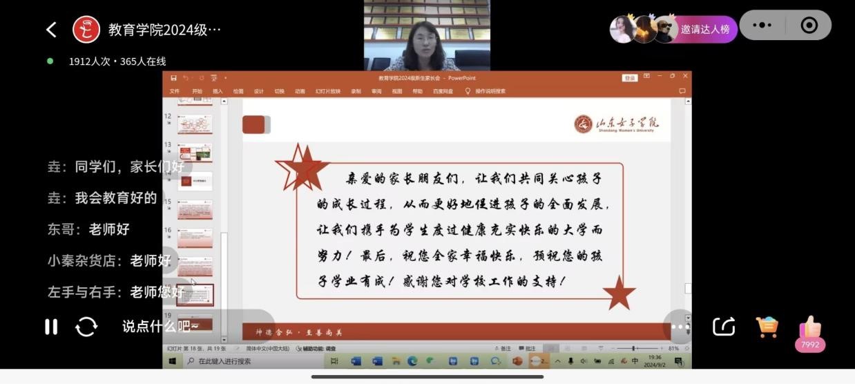 为促进家校沟通交流,构建家校共育桥梁,助力学生全面发展,9月2日,教育学院举行“怀爱于心,共育于行”2024级线上新生家长会。教育学院党委副书记路敏、副院长刘源、全体新生辅导员、班主任及新生家长参加了本次会议。会议由新生辅导员宫翠萍主持。