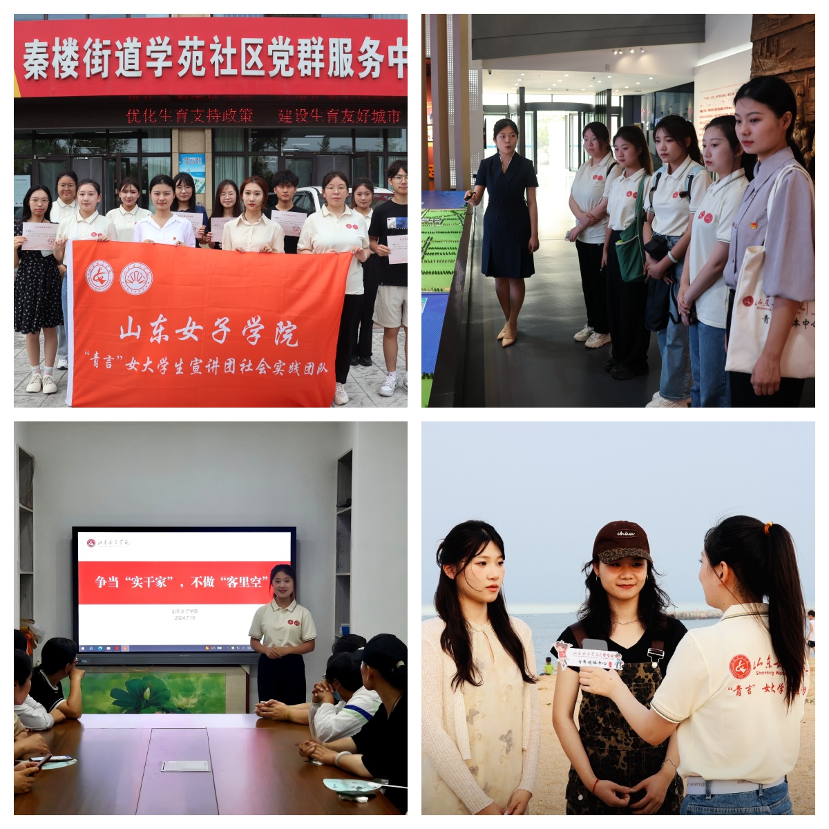 2024年暑假,山东女子学院积极响应上级团组织号召,在开展“青春年少好读书”活动基础上,广泛参与“青春为中国式现代化挺膺担当”暑期社会实践活动,组织“青言”女大学生宣讲团赴日照市东港区实地调研走访,沿着习近平总书记的脚步,体悟习近平总书记在山东考察时的重要讲话精神,向当地青年宣讲《习近平与大学生朋友们》,共同感受总书记对青年的关怀和殷切期望。