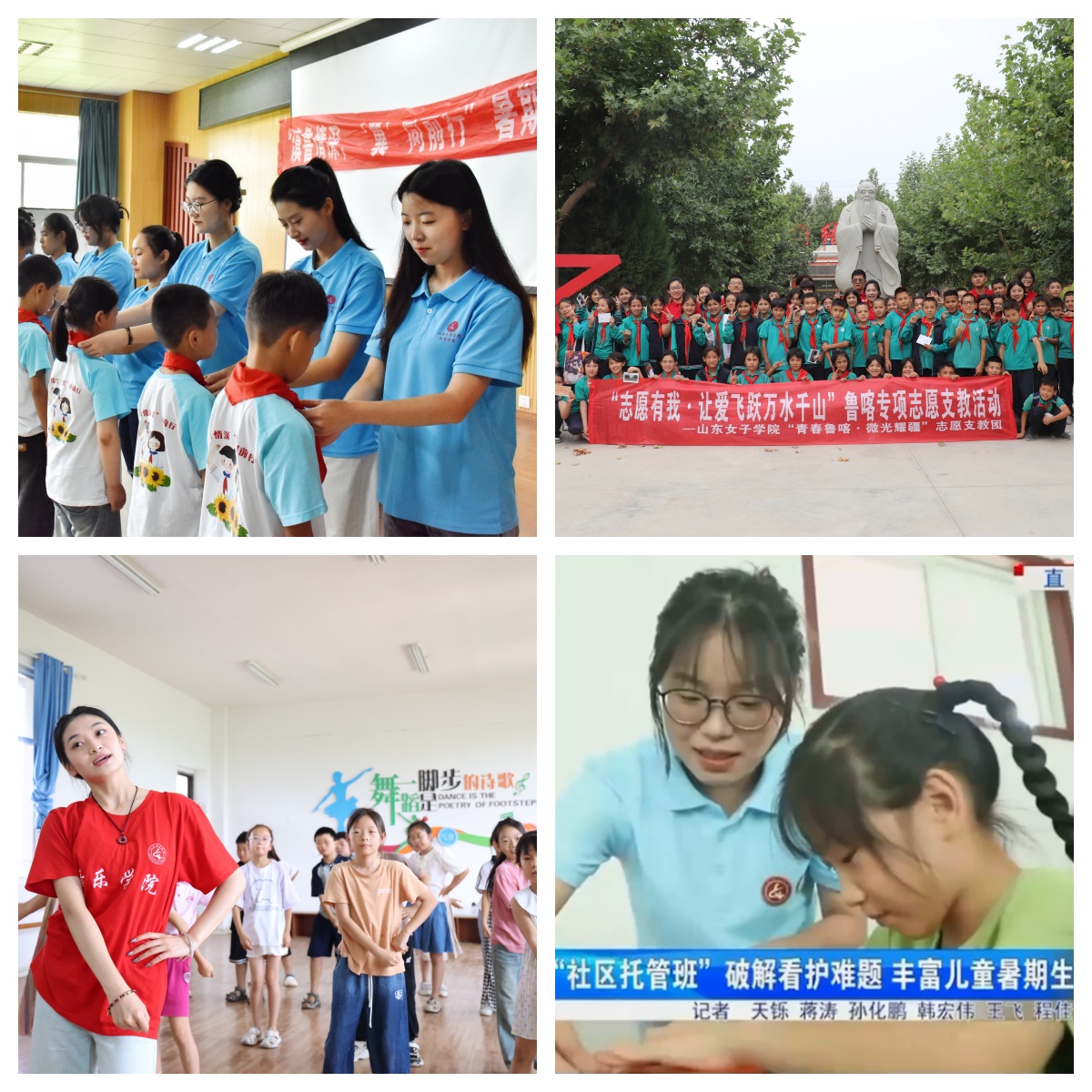 云南华坪女高张桂梅校长曾说过“女孩子受教育可以改变家庭三代人的命运”,这让同为女子院校的青年学子倍受鼓舞、倍感责任重大。在张桂梅事迹的指引下,工商管理学院“青春鲁喀· 微光耀疆”志愿支教团走进新疆喀什地区英吉沙县第一小学,为孩子们带去知识与关爱的同时,播种民族团结精神与爱国情。社会与法学院遇“健”你志愿服务健康队在在济南市儿童福利院开展了一场充满温情与关爱的志愿服务活动。“我们的目标很简单,那就是让每个孩子身体更加健康,心灵更加坚强。”队长秦焕同学说。女院青协“团小青”志愿服务队在济南市长清区乐天创科社区、紫薇阁社区社区托管班暖心支教活动,“五次方”课业辅导不仅解决了家长的暑期带娃难题,也让孩子们拥有了一个自律、充实、快乐的假期生活,活动开展情况获山东卫视专题报道。“将美育教育带进乡村。希望通过这些课程,能够开拓孩子们的眼界,拓宽他们视野,帮助他们树立正确的审美观。”音乐学院“音为梦想 乐舞童心”社会实践队队员胡耀军同学说。尽管条件艰苦,但看到孩子们快乐的笑容,队员们深感值得。教育学院“滇鲁情深,‘翼’同前行”暑期社会实践团赴云南宁蒗彝族自治县大兴镇小凉山学校,为孩子们量身定制了手工、彩绘、书法、舞蹈、话剧、体育等特色课程,用教育传递爱心,用爱心播种希望。
