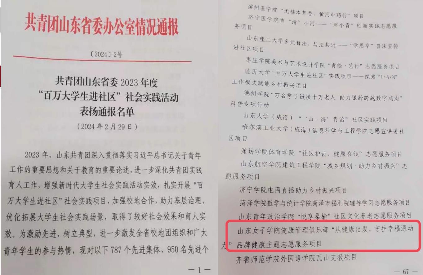 自2019年起,学院健康管理与服务专业的师生始终秉承健康所系,心之所向的宗旨,依托专业特色着力打造“从健康出发,守护幸福原动力”品牌健康管理志愿服务项目,团队通过生理健康指导,心理健康维护,膳食营养策划,体育运动养生等四大方面开展服务,为弱势群体提供合理、个性化健康管理。2023年,团队获得共青团山东省委的通报表扬。
