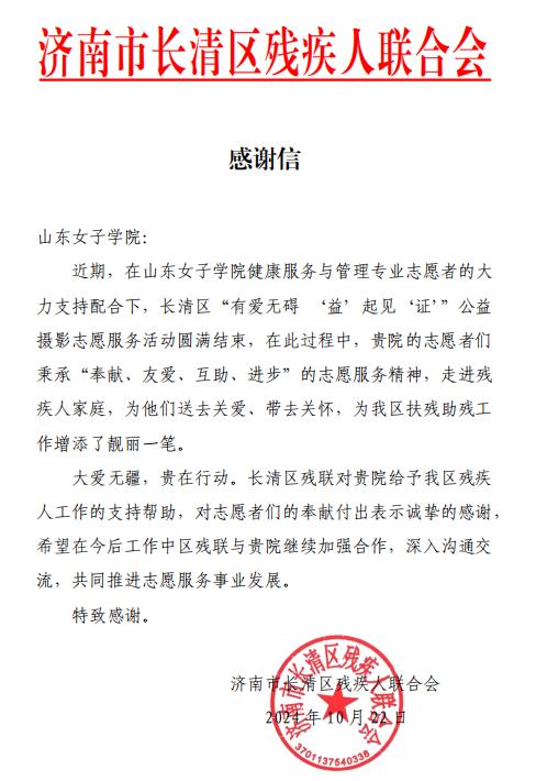 近日,济南市长清区残疾人联合会向学校发来表扬信,表彰健康服务与管理专业的学生在“有爱无碍 ‘益’起见‘证’”公益志愿服务活动中的突出的表现。