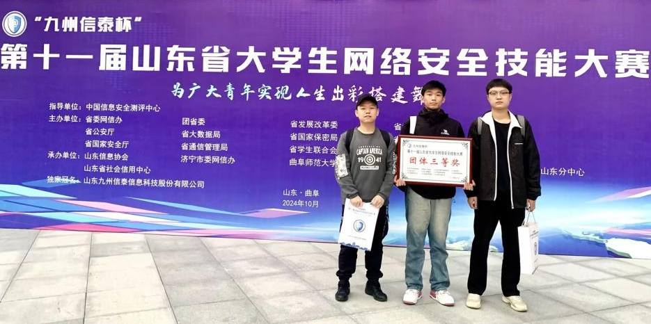 10月27日,第十一届山东省大学生网络安全技能大赛在曲阜师范大学举行。数据科学与计算机学院王明昊(22级计科春考)、冯嘉诚(24级计科学专升本)、瞿成建(23级信息安全技术应用)三位同学组成团队,由杨艳春老师带队参加了比赛。经过6.5个小时的紧张角逐,获得团体三等奖。
