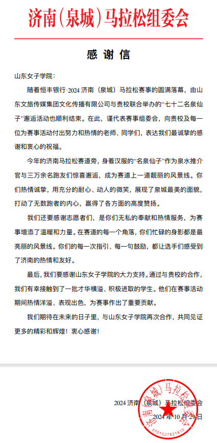 运动员从各个赛点跑过时,仙子们挥舞着宣传牌为运动员们加油呐喊,运动员深受鼓舞,纷纷挥手互动,并与名泉仙子们合影留念,活动反响良好。本次活动,强化了学校与山东文旅集团的校企合作,集团为学生们提供了大型体育赛事活动平台,学校为此次活动提供了仙子及志愿者等人员的输送,不仅满足了学生们参与社会实践活动的需求、丰富了学生们的生活体验。