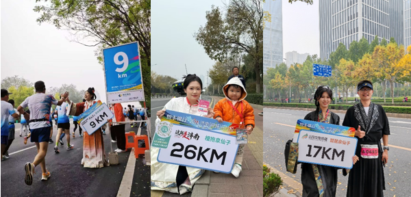比赛当天,同学们身着设计定制的名泉元素的古风汉服,各代表一处名泉,同时也是泉水的推介官。活动现场,“泉水仙子”手举公里牌为三万余名跑友加油助力,成为济马赛道上最亮丽和最具城市特色的一道风景线,在为体育赛事加油喝彩的同时也传播了济南的泉水文化。