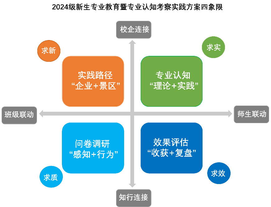 创新求效,“精”研方案。为切实发挥本次专业认知活动“学思践悟、重质求新”的实践效果,教研室创新求效,“精”研方案,设立“专业认知、实践路径、问卷调研、效果评估”四象限,突出“大联动”、“大连接”思路,通过“师生联动、班级联动、校企连接、知行连接”,将专业认知、社会实践、团队协作相融合,帮助新生“以知促行,知行合一”。