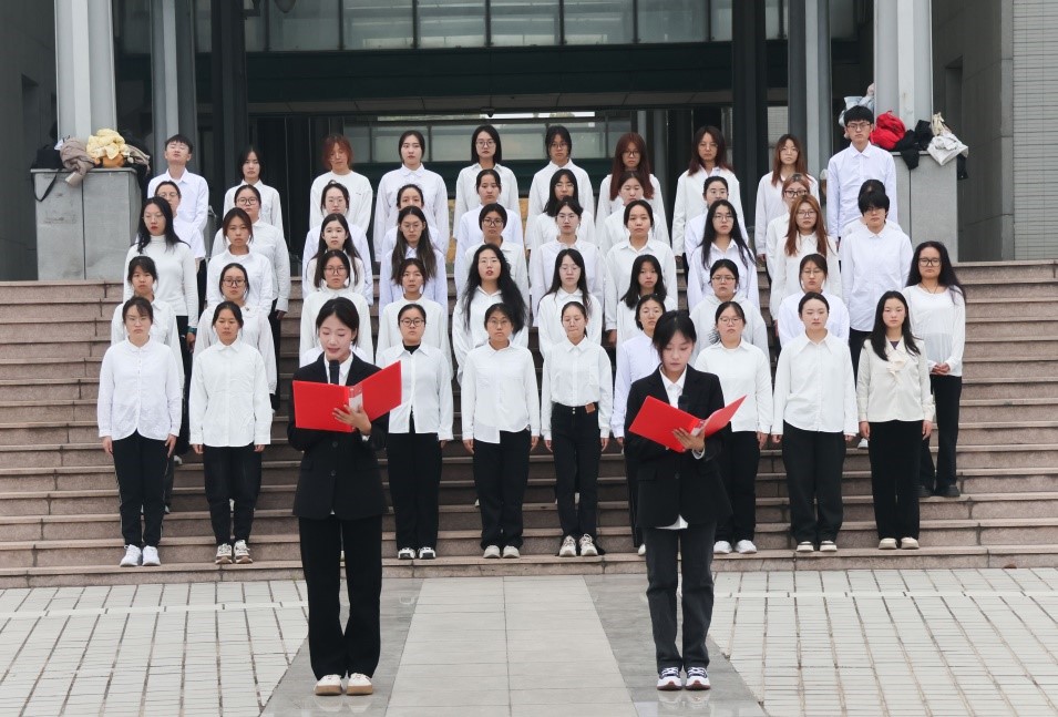 最后,现场师生齐声合唱《山东女子学院校歌》。歌声嘹亮,情感真挚,表达了师生对学校的深厚感情和矢志不渝的爱校之情。用歌声传递着青春的正能量,展现了新时代青年的责任与担当。