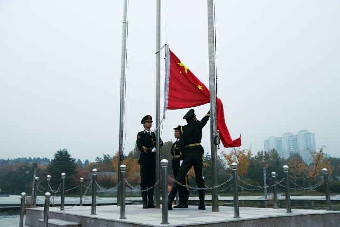 早上7:30,升旗仪式正式开始,在全体学生的注目下,国旗护卫队成员踏着铿锵有力的步伐,护送五星红旗正步走向旗台,伴随着国歌雄壮、悠扬的旋律,五星红旗冉冉升起,迎风飘扬,全体学生面向国旗肃立。