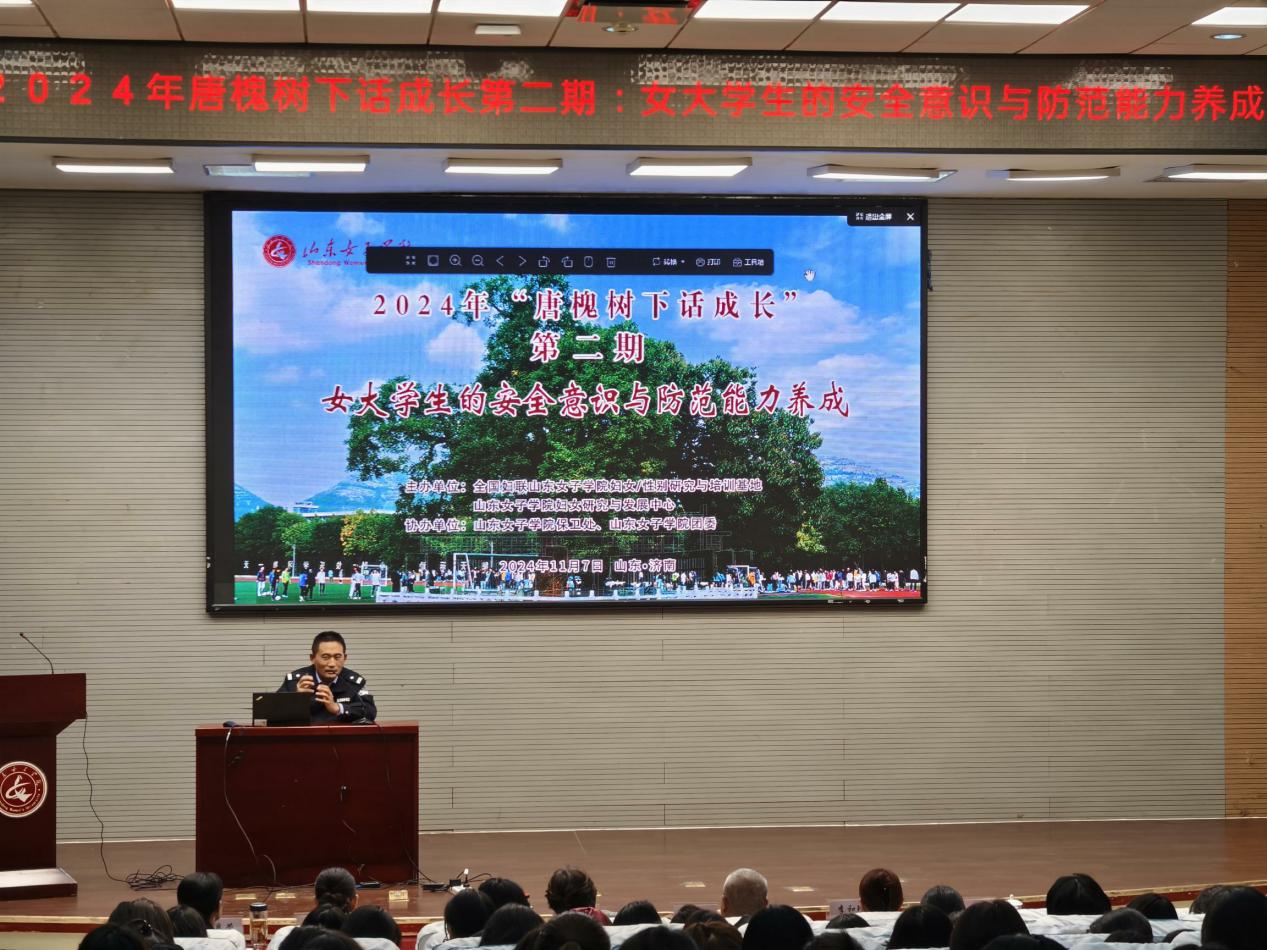 日前,学校妇女研究与发展中心联合保卫处、团委举办了“唐槐树下话成长之‘女大学生的安全意识与防范能力养成’”对话活动。本次活动特别邀请了济南市公安局长清分局高级警长唐军,长清区公安分局防电信诈骗科副中队长杨克,长清区消防救援大队宣传处蓝焰讲师团宣传员李和珍,山东女子学院社会与法学院(社会发展学院)教授、全国维护妇女儿童权益先进个人张雅维。活动由保卫处副处长马良莹主持,妇研中心和保卫处老师们及200多名学生参加了此次活动。