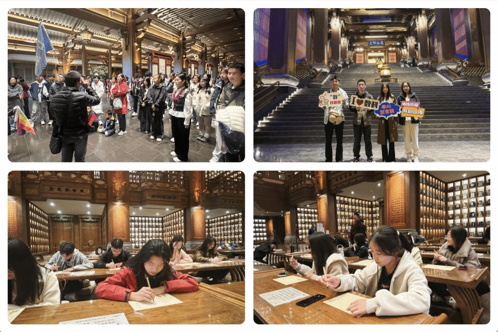在仁厅,同学们围坐一圈,欣赏着传统文化与科技相结合的灯光秀,齐声诵读《论语》中的经典语句,领取毛笔和特制的字帖,认真地抄写论语。电子信息类专业的学生通常沉浸在数字世界和算法逻辑中,这次尼山探访活动为学生们开启了科技与传统文化相融合的新思路。