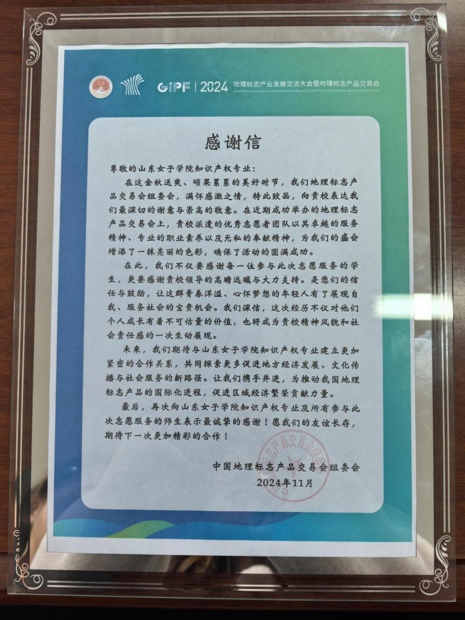 会议结束后,知识产权专业师生收到了来自中国地理标志产品交易会组委会的感谢信,对其“法知守护”志愿服务团队在地理标志产品交易活动中的优秀表现表示诚挚感谢。