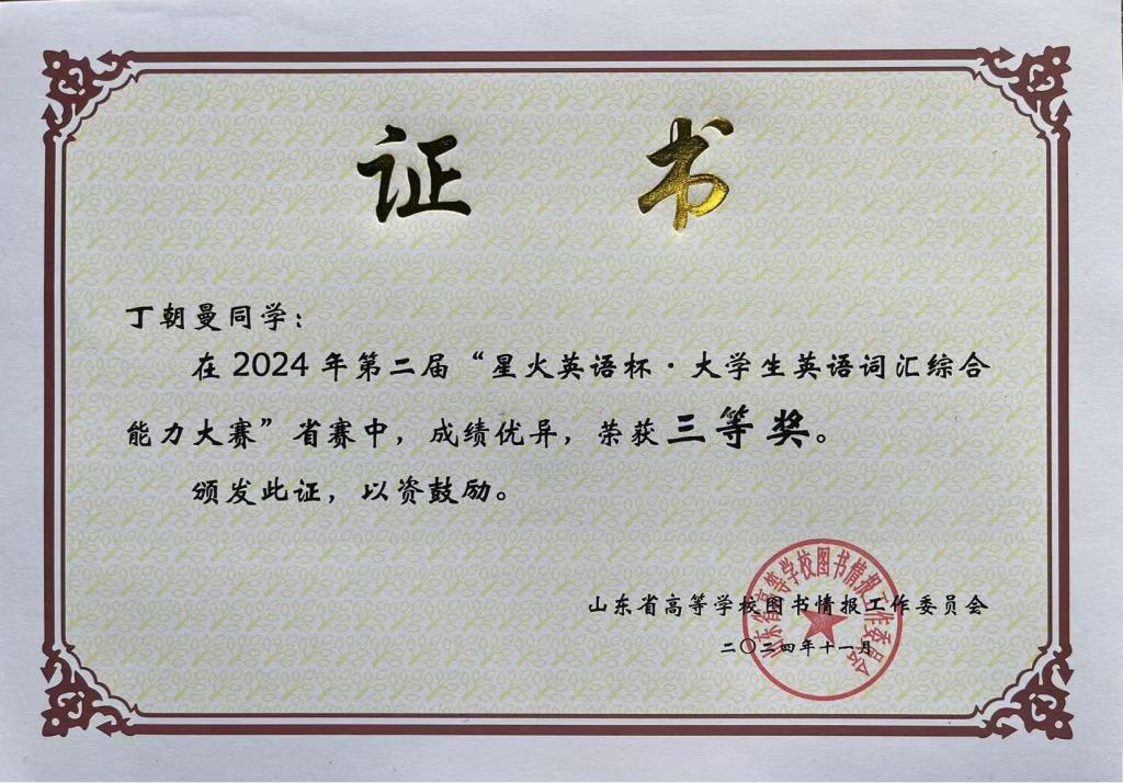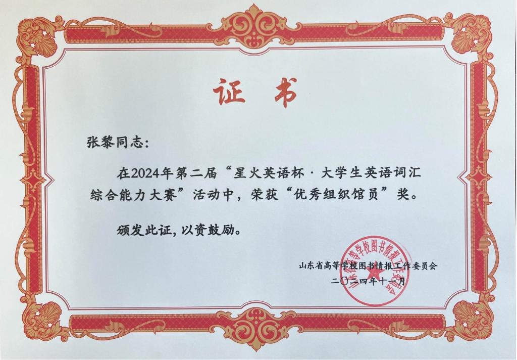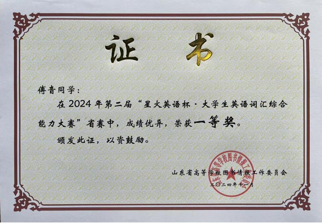 日前,由山东省高等学校图书情报工作委员会主办、山东省高校图工委文化建设专业委员会等联合承办的第二届“星火英语杯?大学生英语词汇综合能力大赛”圆满结束。本次大赛共有来自全省94所高校的两万多名选手参加,经过初赛与决赛的层层选拔,学校外国语学院傅音同学凭借99.00的优异成绩,位列全省第六名,荣获省级一等奖;丁朝曼同学位居全省第51名,荣获省级三等奖。图书馆张黎老师荣获“优秀组织馆员奖”。
