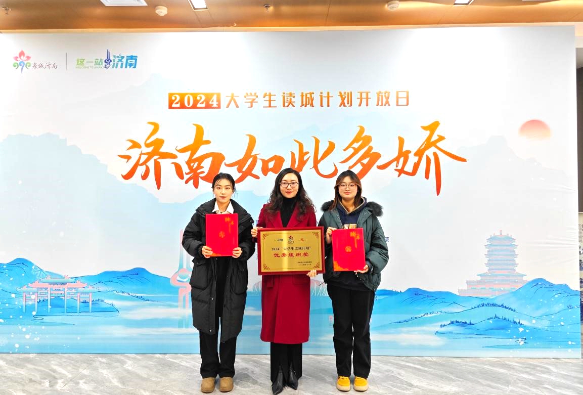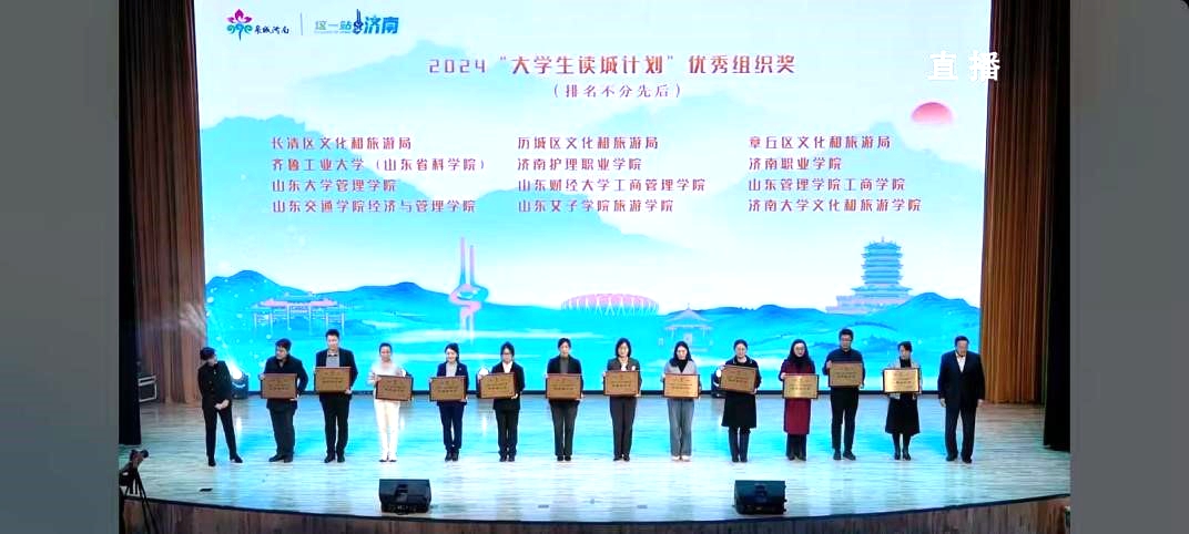 11月28日,在“这一站,济南”2024大学生读城计划开放日活动中,旅游学院荣获优秀组织奖,会展经济与管理(校企)23本学生贾雨彤和宋圆宏荣获“文化济南宣传推广大使”称号。