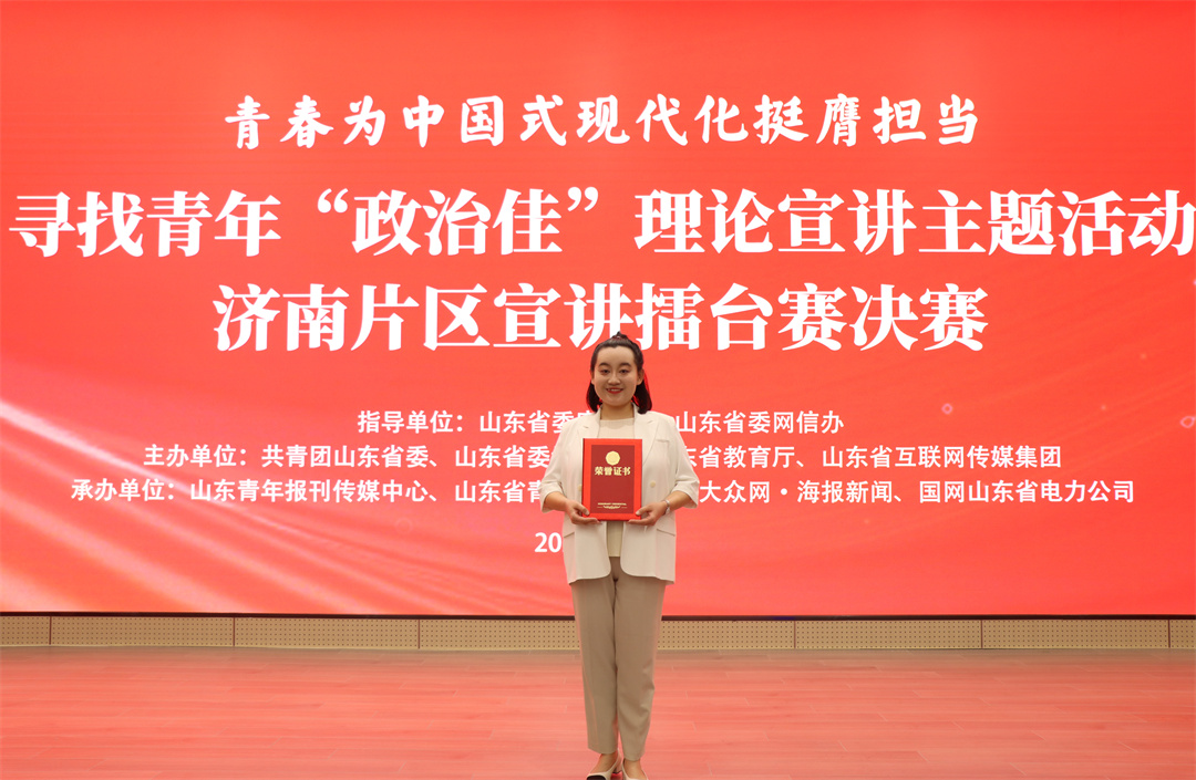 本次活动设置初赛、复赛和决赛三个环节,以“线上初赛+线下决赛”的形式进行。济南片区赛有来自济南、淄博、东营、德州、聊城、滨州以及驻地省属高校、企业的220余名参赛选手,杨晓斐老师积极备赛,从中脱颖而出,进入济南片区总决赛。在总决赛中,紧扣“青春为中国式现代化挺膺担当”主题,贴近实际、贴近生活、贴近青年,说理深入浅出、材料典型准确、形式生动活泼,用青年乐于接受的方式,把党的创新理论等讲得鲜活深刻,脱稿宣讲得到评委认可,荣获三等奖。