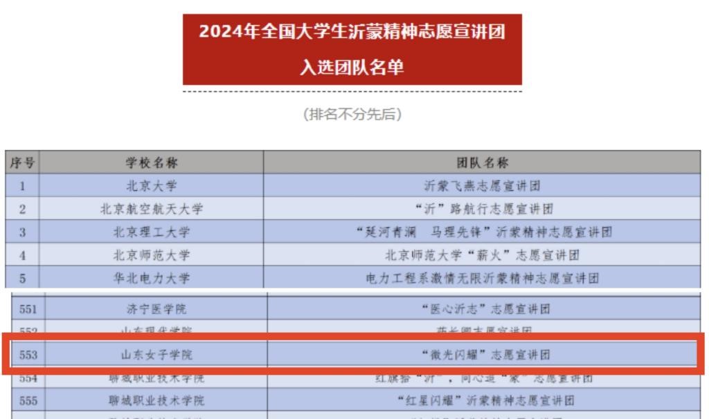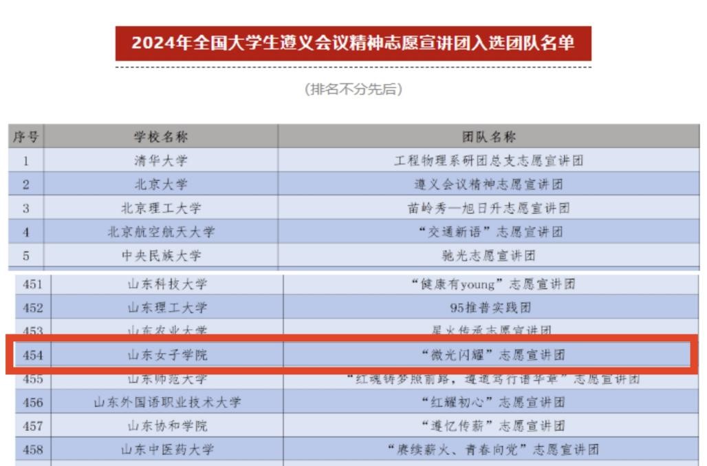 日前,团中央青年志愿者行动指导中心公布了2024年全国大学生沂蒙精神志愿宣讲团和2024年全国大学生遵义会议精神志愿宣讲团入选团队名单。我校工商管理学院微光闪耀志愿宣讲团同时入选,这是团队继今年5月入选2024年全国大学生西柏坡精神志愿宣讲团后,再次入选2项全国志愿宣讲团。