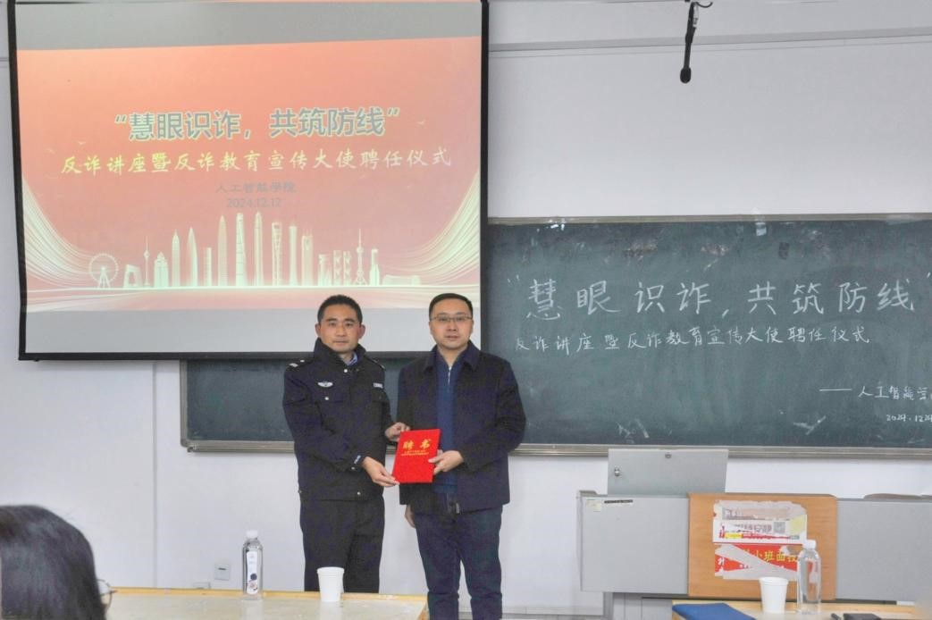 讲座现场,学院王鲁教授结合人工智能学院师生的实际对本次活动进行了介绍,强调了活动的重要性,并为杨克警官颁发反诈教育宣传大使聘任证书。