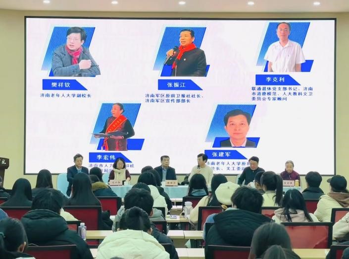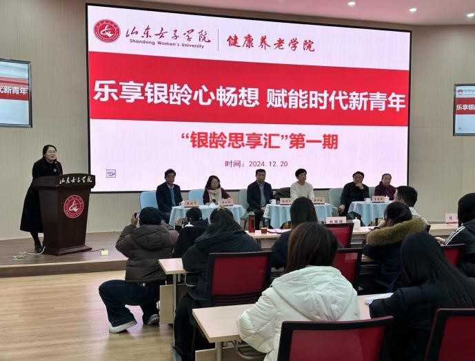 为提升养老人才专业素养,激发新时代青年潜能。12月20日由健康养老学院与济南市老年大学志愿团合作举办的“银龄思享汇”在求真楼报告厅举行。济南老年人大学副校长樊祥钦及张振江、李克利、李宏伟、张建军四位长者出席活动。健康养老学院党委书记赵丽丽、院长闫小红及师生代表参加活动。活动由闫小红主持。