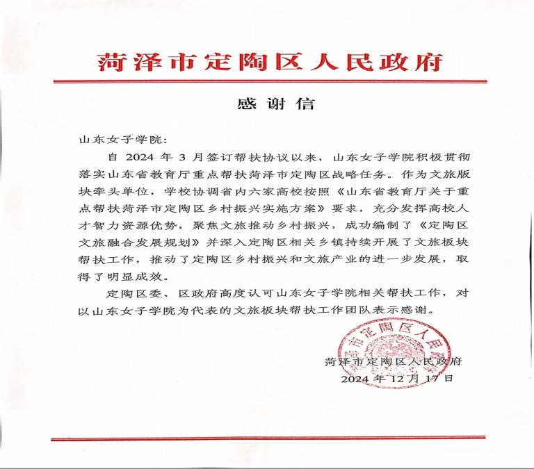 为深入贯彻落实山东省教育厅明升体育:乡村振兴重点帮扶工作的统一部署,进一步对接帮扶菏泽市定陶区文旅融合发展,推进乡村振兴工作。12月17日,学校合作发展处处长于子云、旅游学院副院长鲁春晓工作组一行6人赴菏泽市定陶区开展调研对接。菏泽市定陶区委书记韩耀辉、区政协主席单翔出席座谈会,相关政府部门负责人参加座谈。