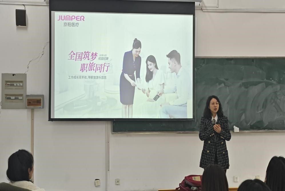 在企业宣讲环节,全国总工会职工健康管理中心、深圳京柏医疗等3家企业代表分别介绍了企业的基本情况、发展前景、人才需求以及薪资待遇等信息,会间同学们就自己关心的问题与企业代表进行了深入地互动交流。