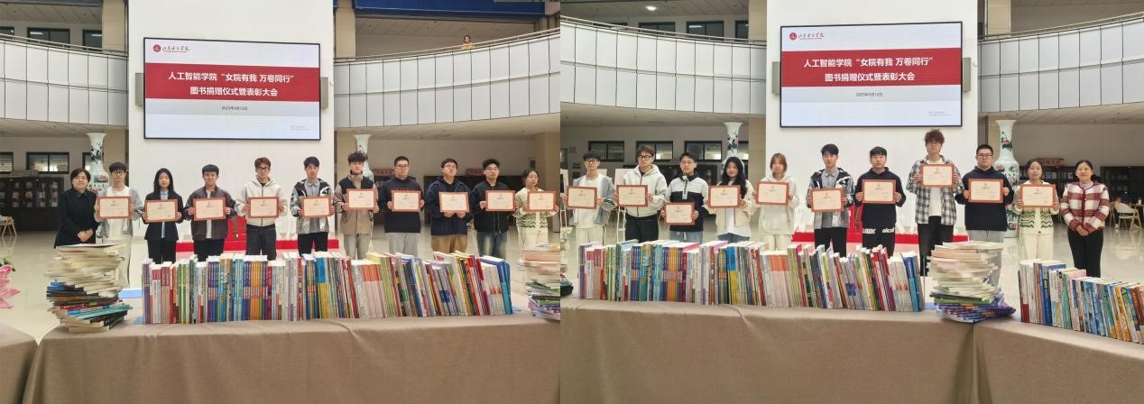 为弘扬书香文化,凝聚爱校情怀,助力学校高质量发展,人工智能学院于3月12日下午在图书馆举行“女院有我 万卷同行”图书捐赠仪式暨表彰大会。图书馆馆长成曙霞、学院党委书记崔江宁及教师、学生代表共同参加活动,以书籍传递智慧,以行动彰显担当,助力学校发展。
