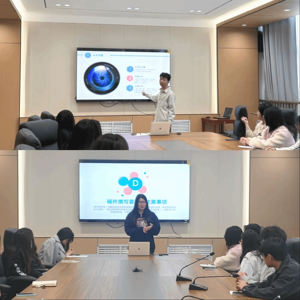 在培训环节,学院新媒体部的两位负责人凭借丰富的实践经验,深入分享了视频制作、海报设计以及文字编辑等方面的实用技巧。他们巧妙融入AI 技术在新媒体创作中的前沿应用案例,比如智能剪辑软件如何大幅提升视频制作效率、AI辅助文案撰写怎样为内容创作注入全新灵感等,为同学们推开了一扇通往“智”媒创作新境界的大门,让大家对新媒体工作有了更为透彻、“智”性的认知。同学们深受启发,纷纷表态将积极运用创新思维,熟练借助智能工具,全力讲好学院的“智”造故事,以实际行动为打造“智媒先锋队”添砖加瓦。