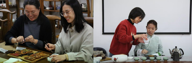 随后师生在共创传匠心的互动环节中共制“春日限定茶包”。张丽娜老师现场指导调配花草茶比例,老师和同学们精选玫瑰、桂圆、枸杞等天然原料,共同制作精美茶包。张丽娜老师亲自示范闽式盖碗茶冲泡技艺,从“关公巡城”的均匀分茶,到“韩信点兵”的精准滴斟,她以通俗的语言来讲解专业手法,现场的浓厚氛围让老师和同学们体会到茶文化的底蕴。