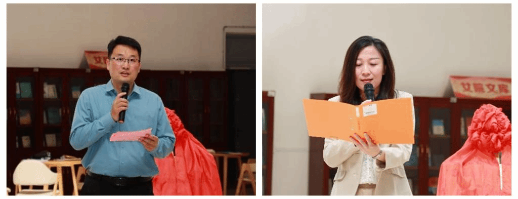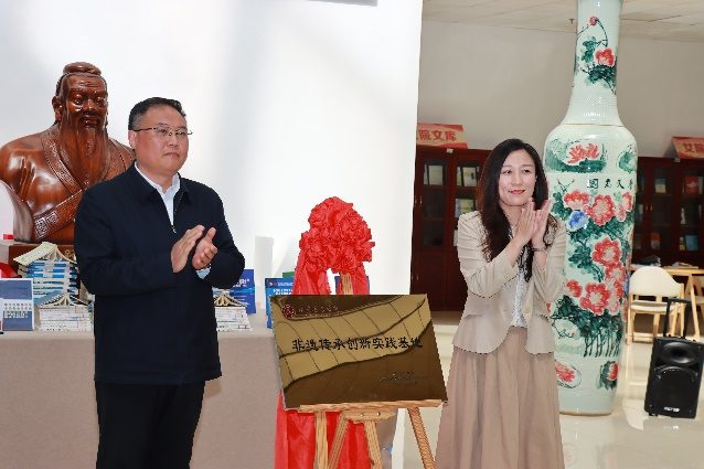 4月17日上午,活动启动仪式在图书馆举行。龙希利与张琳共同为“非遗传承创新实践基地”揭牌,标志着“非遗传承+艺术创新+数字赋能”三位一体的产学研合作平台正式搭建。校团委负责人和张琳分别代表主办单位致辞,共同期待通过资源整合,推动非遗保护与高校艺术教育的深度融合。