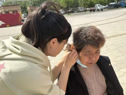 在耳穴压豆区,大学生为老人们详细讲解了耳穴压豆的原理和功效,根据老人们不同的健康需求进行相应穴位粘贴,同时教会老人们自行按压耳穴处以期达到更好的保健效果。老人们积极与大学生互动交流,对这一新奇且实用的方法表现出浓厚兴趣。